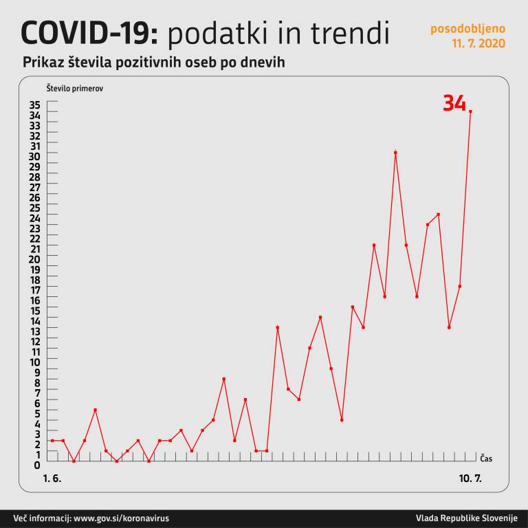 Včeraj, 10. julija, so v Sloveniji opravili 1.159 testiranj na novi koronavirus. Odkrili so kar 34 novih okužb, kar je dvakrat več kot dan prej.
