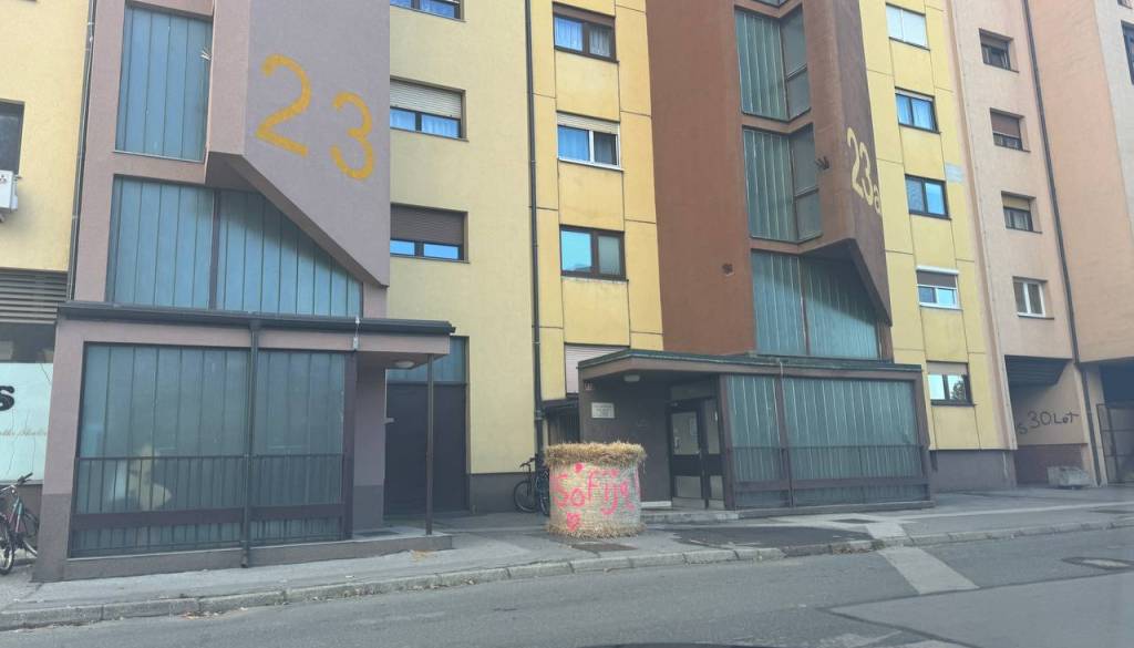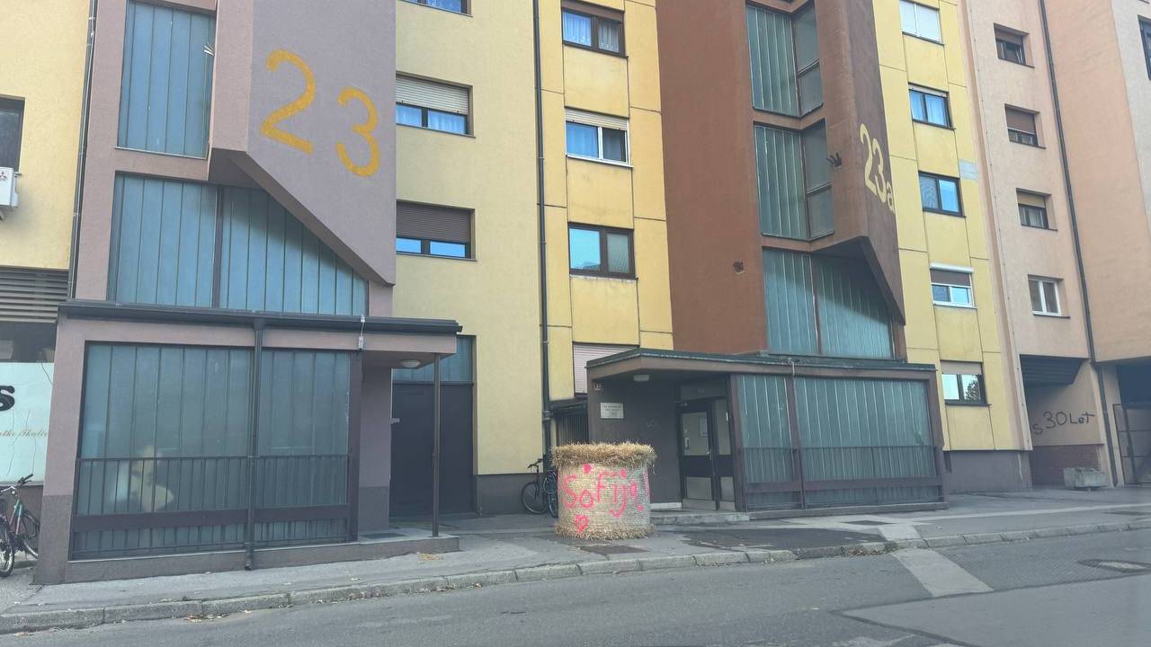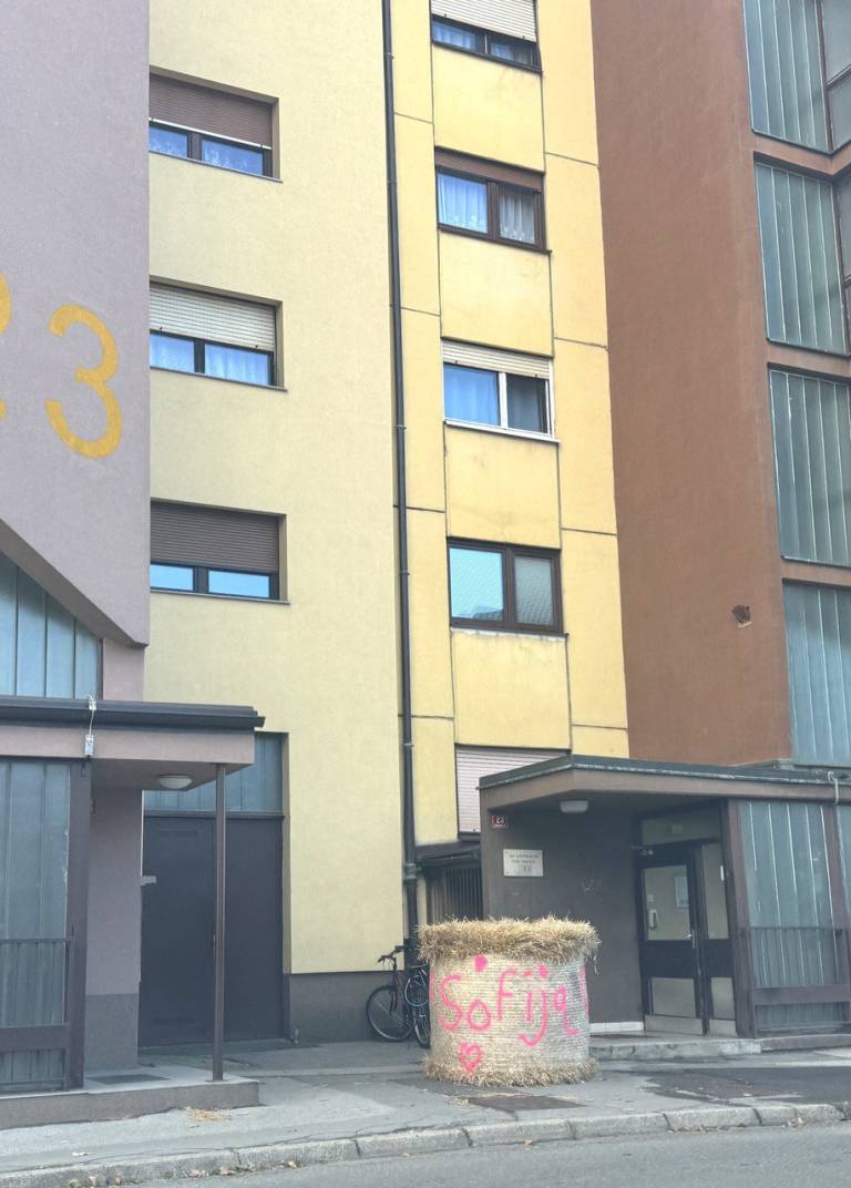 Na Lendavski ulici v Murski Soboti smo danes pred stanovanjskimi bloki opazili zanimiv prizor - pred vhodom v eno od stavb je postavljena velika bala sena, na njej pa v roza barvi dodan napis »Sofija«.