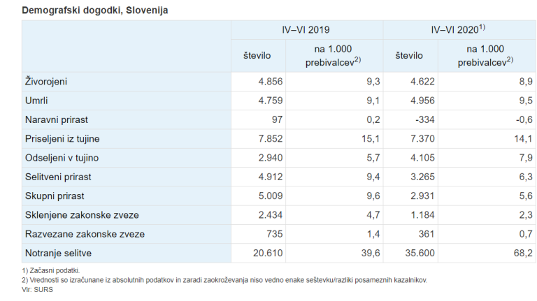 V drugem četrtletju 2020 se je rodilo 4.622, umrlo pa je 4.956 prebivalcev. Število rojenih je bilo za 234 (4,8 %) nižje, število umrlih pa za 197 (4,1 %) višje kot v istem obdobju leta 2019, so sporočili iz Statističnega urada RS.