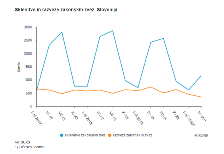 V drugem četrtletju 2020 se je za poroko odločilo 1.184 parov ali 51,4 % manj kot v istem obdobju leta 2019. Ločilo se je 361 parov ali 50,9 % manj kot v drugem četrtletju 2019. Nižje število porok in razvez na Statistične uradu povezujeo z ukrepi za zajezitev širjenja novega koronavirusa.