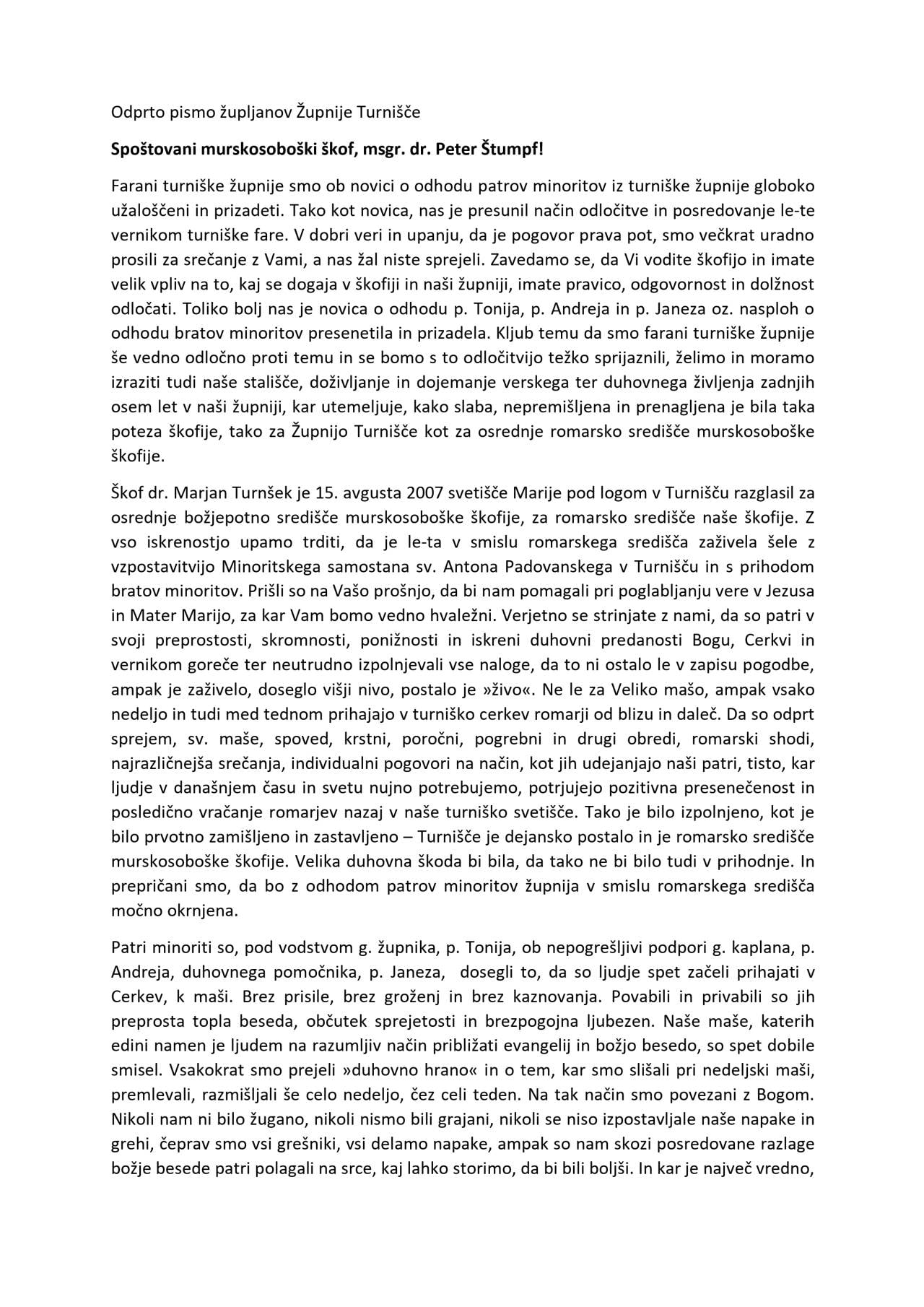 Po tem, ko je škof murskosoboške škofije Peter Štumpf prejšnji teden uradno sporočil, da patri minoriti, ki od leta 2015 vodijo župnijo Turnišče, iz te župnije odhajajo, se verniki iz vasi Turnišče, Renkovci, Gomilica, Nedelica, Lipa in Brezovica, ne morejo sprijazniti z odločitvijo škofije.