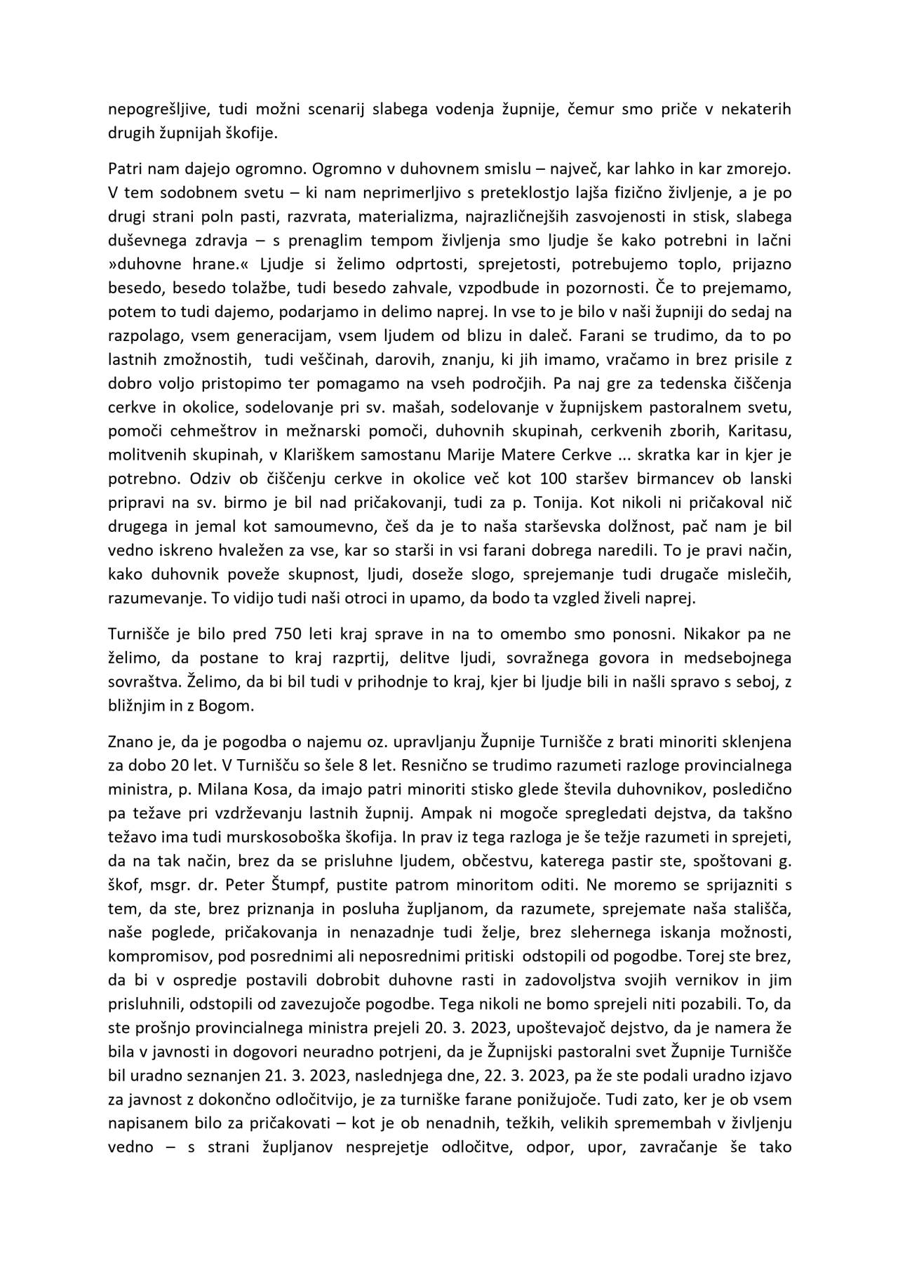 Podpisane župljane moti predvsem kratek čas odločanja o odhodu patrov minoritov. Škofija je namreč prošnjo provincialnega ministra prejela 20. marca 2023, dan za tem se je o nameri seznanil Župnijsko pastoralni svet Župnije Turnišče, nato pa je že 22. marca 2023 škof podal uradno izjavo za javnost z dokončno odločitvijo.