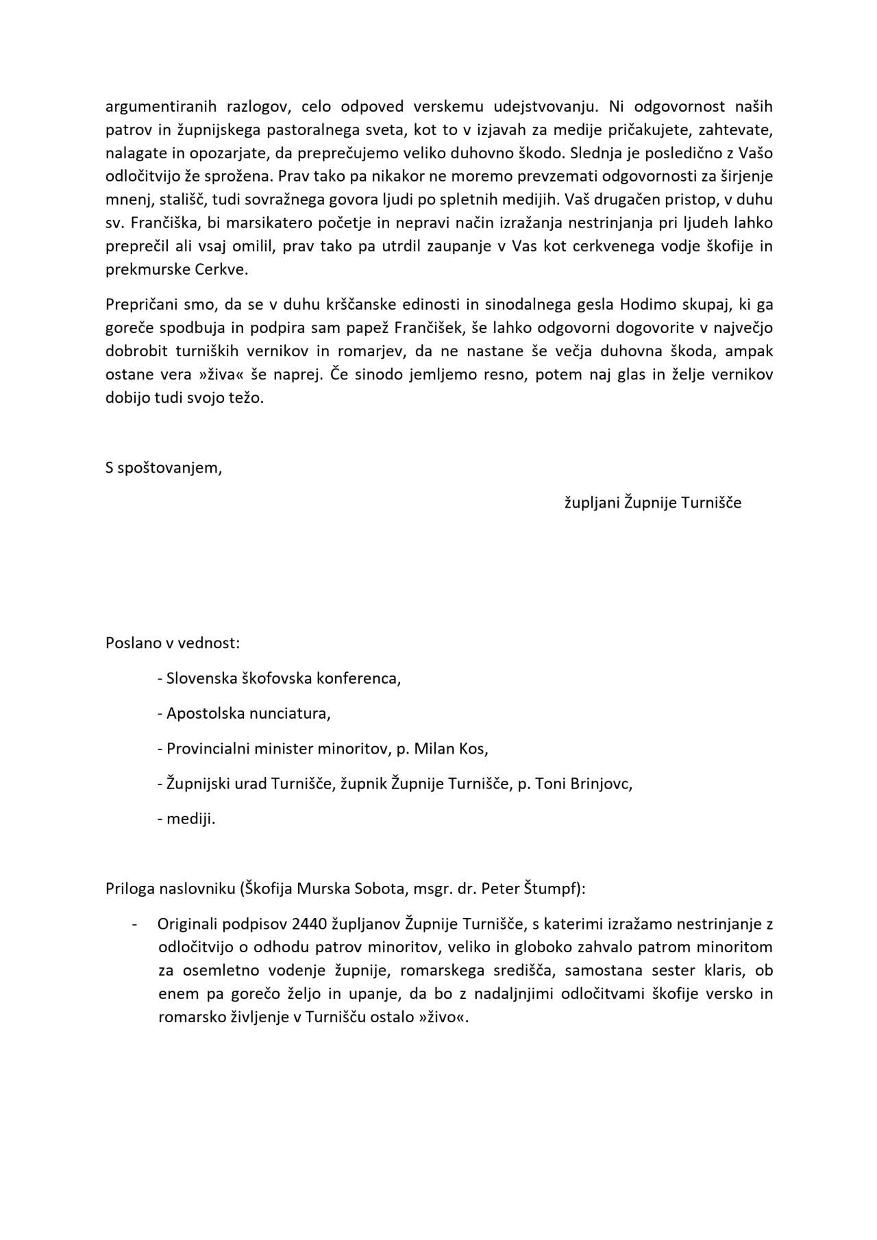 »Ne moremo se sprijazniti s tem, da ste, brez priznanja in posluha župljanom, da razumete, sprejemate naša stališča, naše poglede, pričakovanja in nenazadnje tudi želje, brez slehernega iskanja možnosti, kompromisov, pod posrednimi ali neposrednimi pritiski odstopili od pogodbe,« so zapisali župljani turniške župnije.