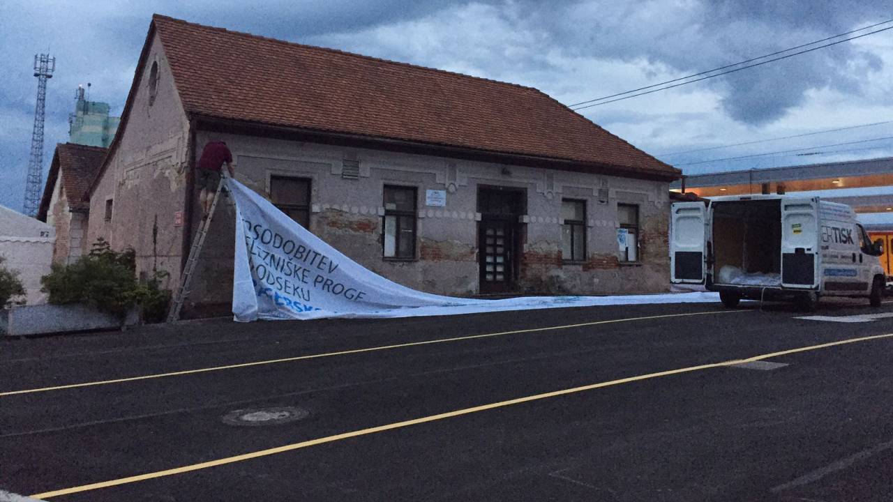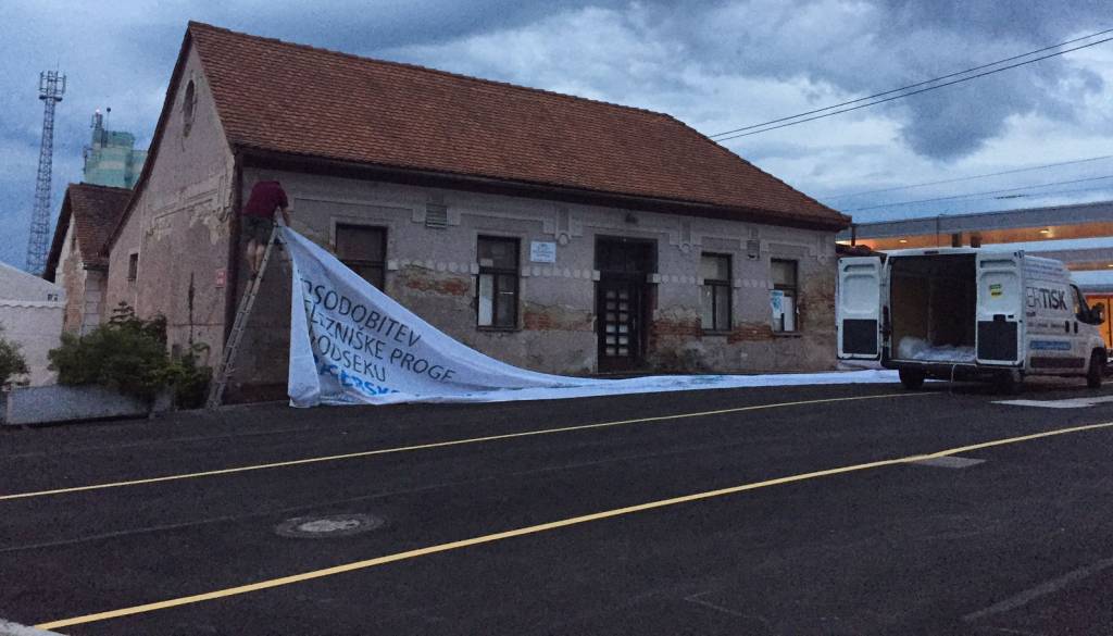Za njihove oči bo jutri okolica železniške postaje še posebej bleščeče urejena. Tudi propadajoča stavba, nekdanja gostilna, dobiva novo podobo. Če je že zaradi težav s pridobivanji dovoljenj lastniki ne morejo porušiti, so ji pa vsaj nadeli nova oblačila. Saj ni res, si mislite. Pa je. Celotno pročelje stavbe delavci tik pred temo opremljajo s potiskanimi ceradami, ki nizajo hvalospeve zaključenemu projektu. Če že težave ne morejo rešiti, jo bodo organizatorji prireditve vsaj skrili.