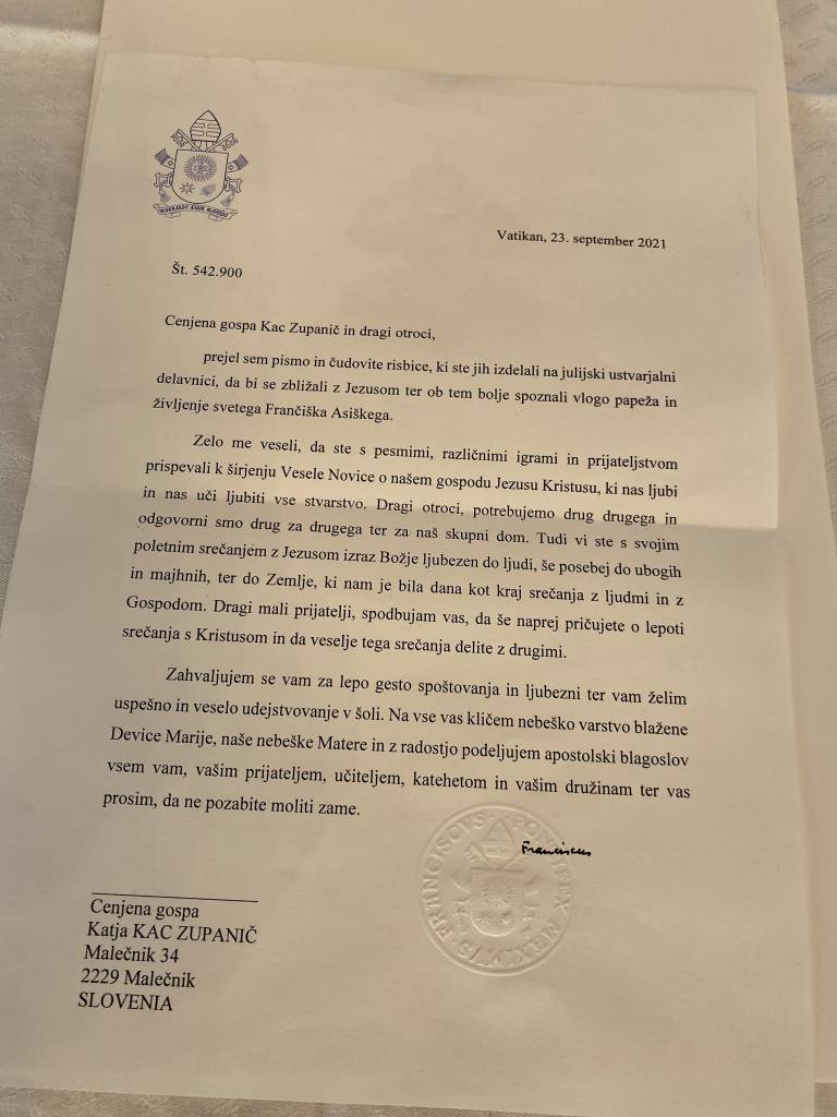 »To da je pismo prispelo v slovenščini pomeni, da je papež res želel direktno nagovoriti otroke. To je eno redkih pisem, ki je v slovenskem jeziku podpisano in z žigom papeža. Vrednost pisma je zato še toliko večja,« pojasni Alojz Cvikl, mariborski nadškof.