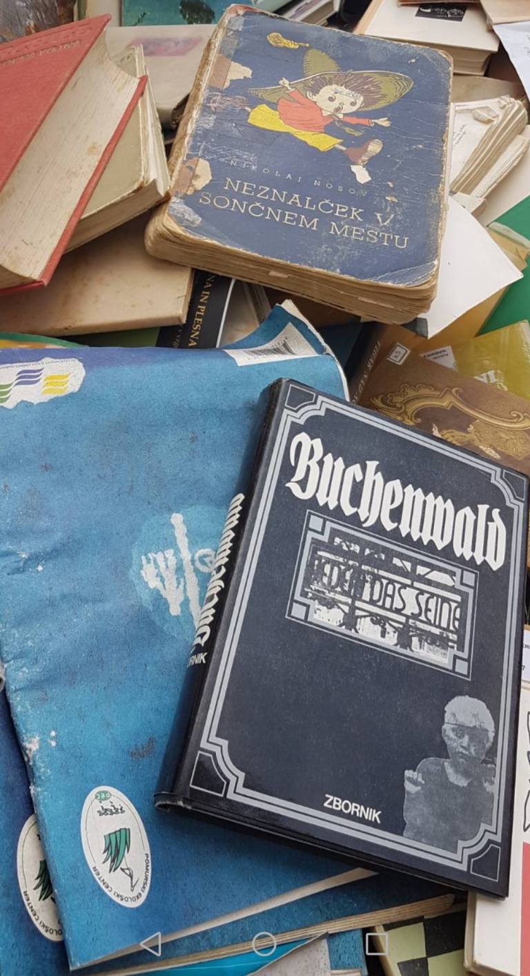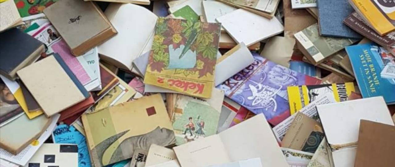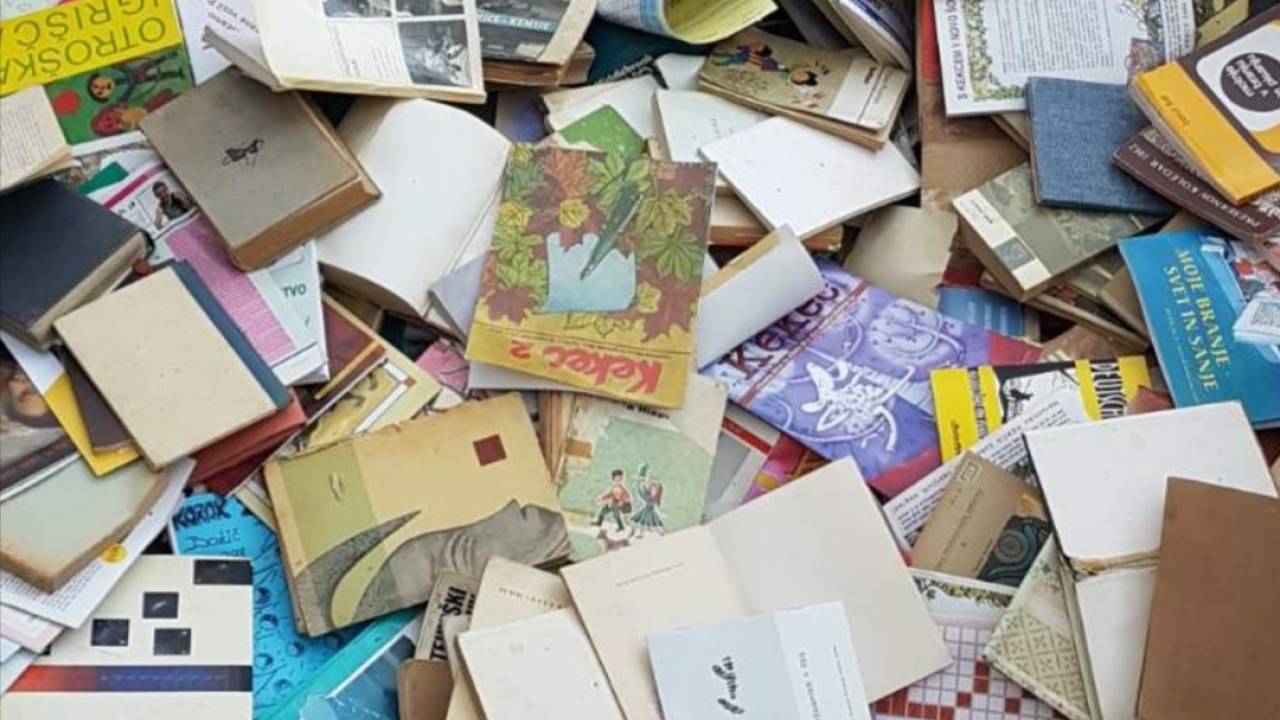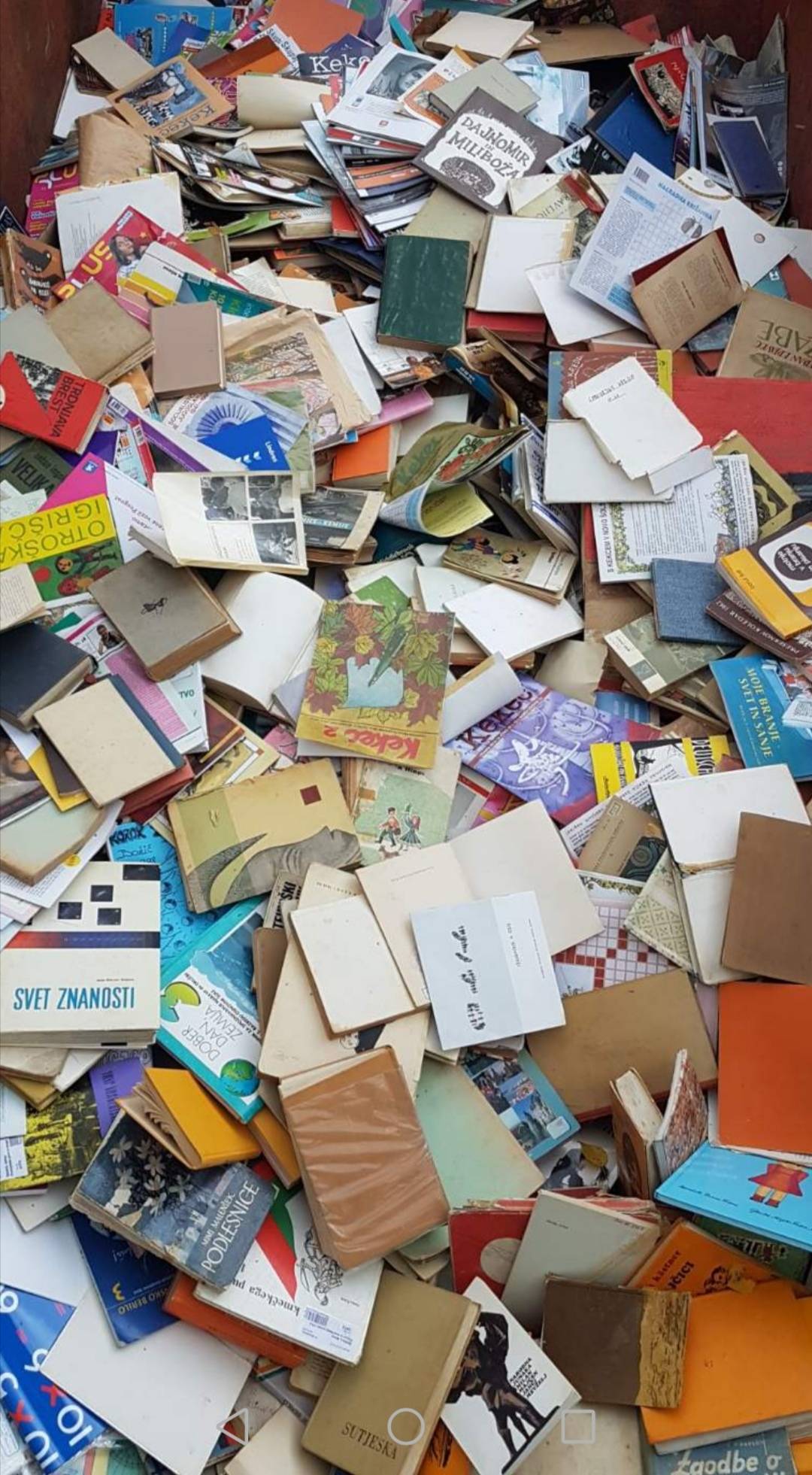 Na fotografijah so kupi knjig in slikanic, ki so končale v zabojniku.