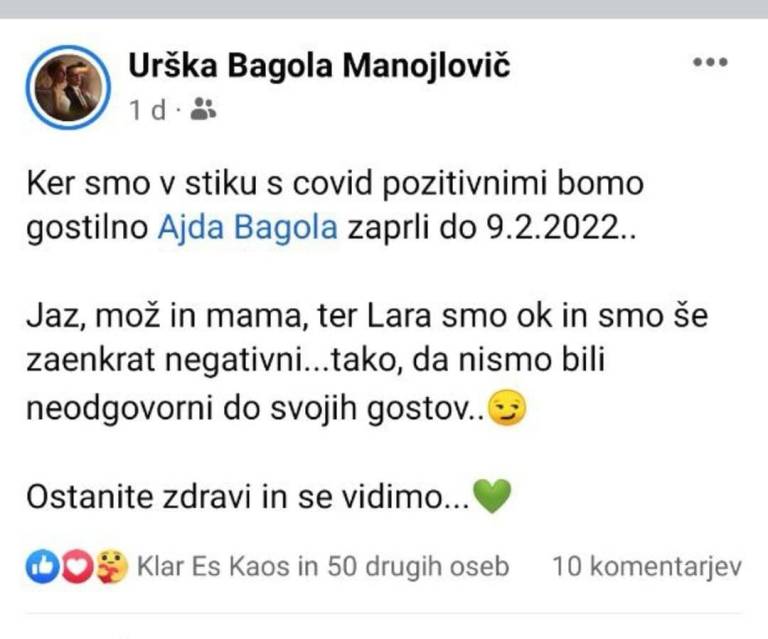 »Ker smo v stiku s covid pozitivnimi, bomo gostilno Ajda zaprli do 9. februarja 2022.«