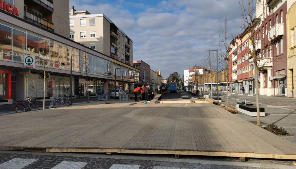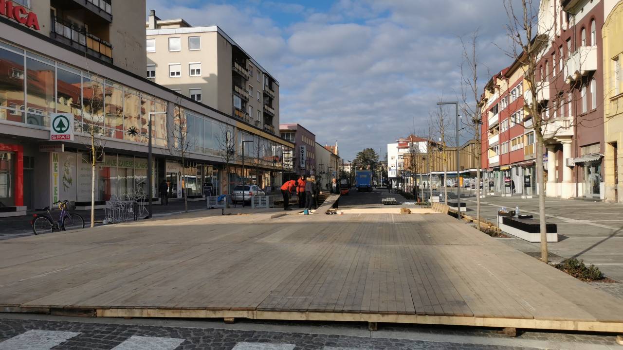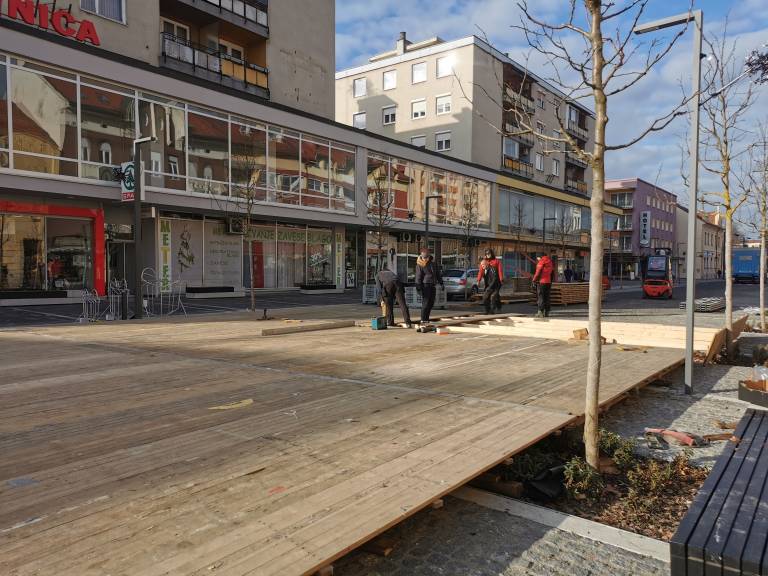 Že včeraj smo poročali, da so se na Slovenski ulici začela pripravljalna dela za postavitev drsališča. Delavci komunale so odstranjevali klopi in druge ovire, da je lahko izvajalec, Kota Petrovče danes začel s postavitvijo lesene podlage za drsališče.
