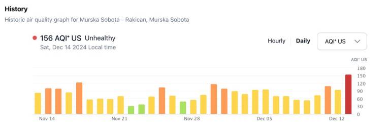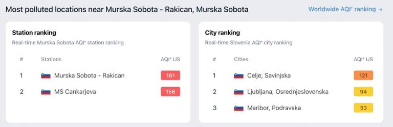 Podatki kažejo, da je Murska Sobota - Rakičan z vrednostjo 161 AQI med najbolj onesnaženimi postajami v državi, takoj za njo sledi Murska Sobota Cankarjeva s 156 AQI.