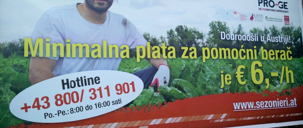 Zagotovo je marsikoga zmotil napis na ogromnem obcestnem panoju v sosednji avstrijski Radgoni, ki oglašuje minimalno plačilo 6 evrov na uro za delo pomožni berač. Ne, Avstrijci ne iščejo asistentov beračem, ravno tako ne gre za oglas za delo v srbskem ali hrvaškem jeziku. Gre za informativno akcijo, s katero poskušajo pomagati sezonskim delavcem.
