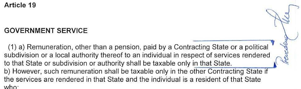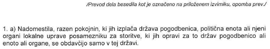 Dosedanja slovenska verzija 19. člena konvencije, v prvem odstavku pravi, da »Nadomestila, razen pokojnin, ki jih izplača država pogodbenica, politična enota ali njeni organi lokalne uprave posamezniku za storitve, ki jih opravi za to državo pogodbenico, politično enoto ali njen organ lokalne uprave pri opravljanju državnih funkcij, se obdavčijo samo v tej državi.«