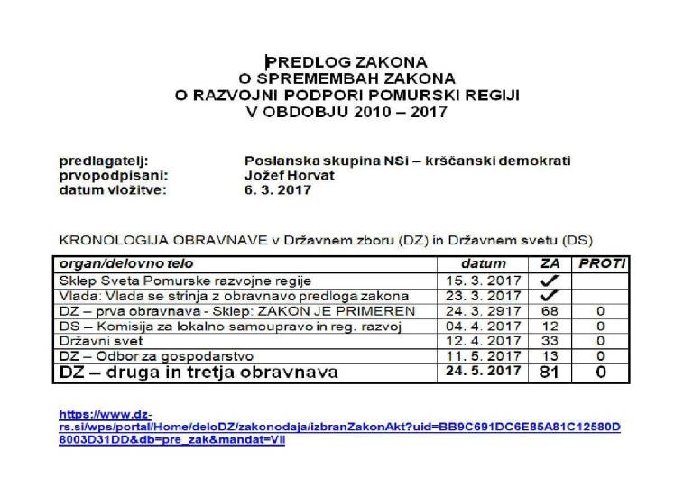 Stranka NSi s pomurskim poslancem Jožefom Horvatom na čelu je opozorila, da vlada tudi v letih 2016 in 2017 ni uspela zagotoviti zadostnih sredstev iz proračuna, s katerimi bi lahko izvedli zakon do konca leta 2017. Zato so pripravili predlog novele zakona, s katero bi se njegova veljavnost podaljšala. Poslanci so predlagano podaljšanje Zakona o razvojni podpori Pomurski regiji soglasno sprejeli z 81 glasovi za.