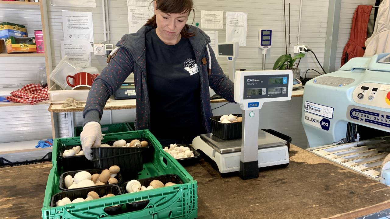 »To pomeni, da dobimo kompost z gobami in vsem skupaj že v teh policah in potem mi to z viličarjem vsak rastlinjak posebej naložimo. Imamo štiri etaže, tu so zdaj tri, tam je ena četrta in potem pobiramo po etažah,« pravi Špela Beranič iz Kmetije Krevh.