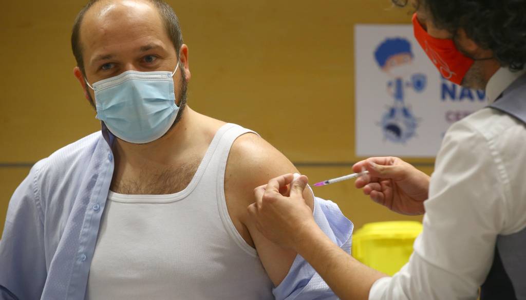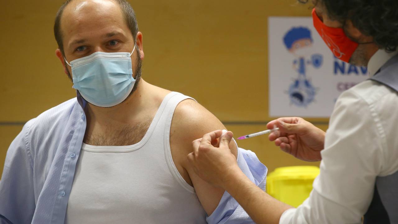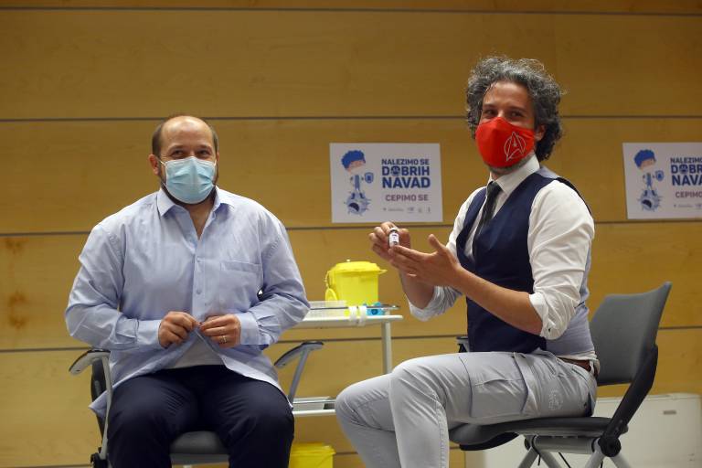 Minister za zdravje Janez Poklukar je danes zavihal rokav in dobil prvi odmerek cepiva AstraZeneca, z injekcijo pa je upravljal nihče drug kot prvi epidemiolog Mario Fafangel.
