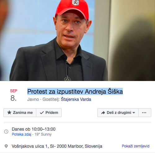 »Osti Jarej. Za izpustitev gospoda Šiška se zberemo v soboto, devetega septembra, pred policijsko postajo na Vošnjakovi ulici v Mariboru,« so zapisali organizatorji Facebook dogodka z nazivom 'Protest za izpustitev Andreja Šiška'.