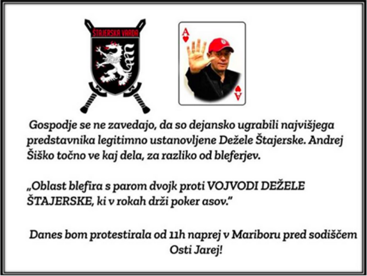 Vodja Štajerske varde Andrej Šiško ostaja v pridržanju, medtem pa so njegovi podporniki pripravili protestni shod na Vošnjakovi ulici v Mariboru pred tamkajšnjo policijsko postajo in pred mariborskim okrožnim sodiščem.