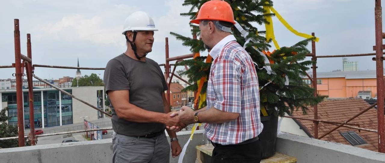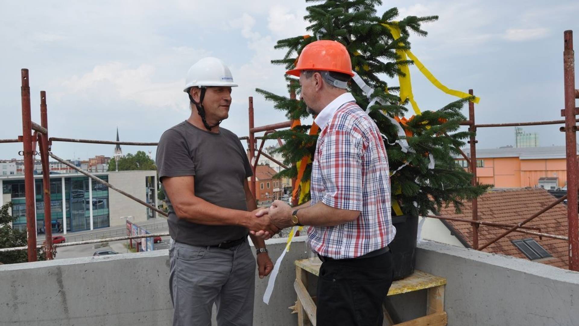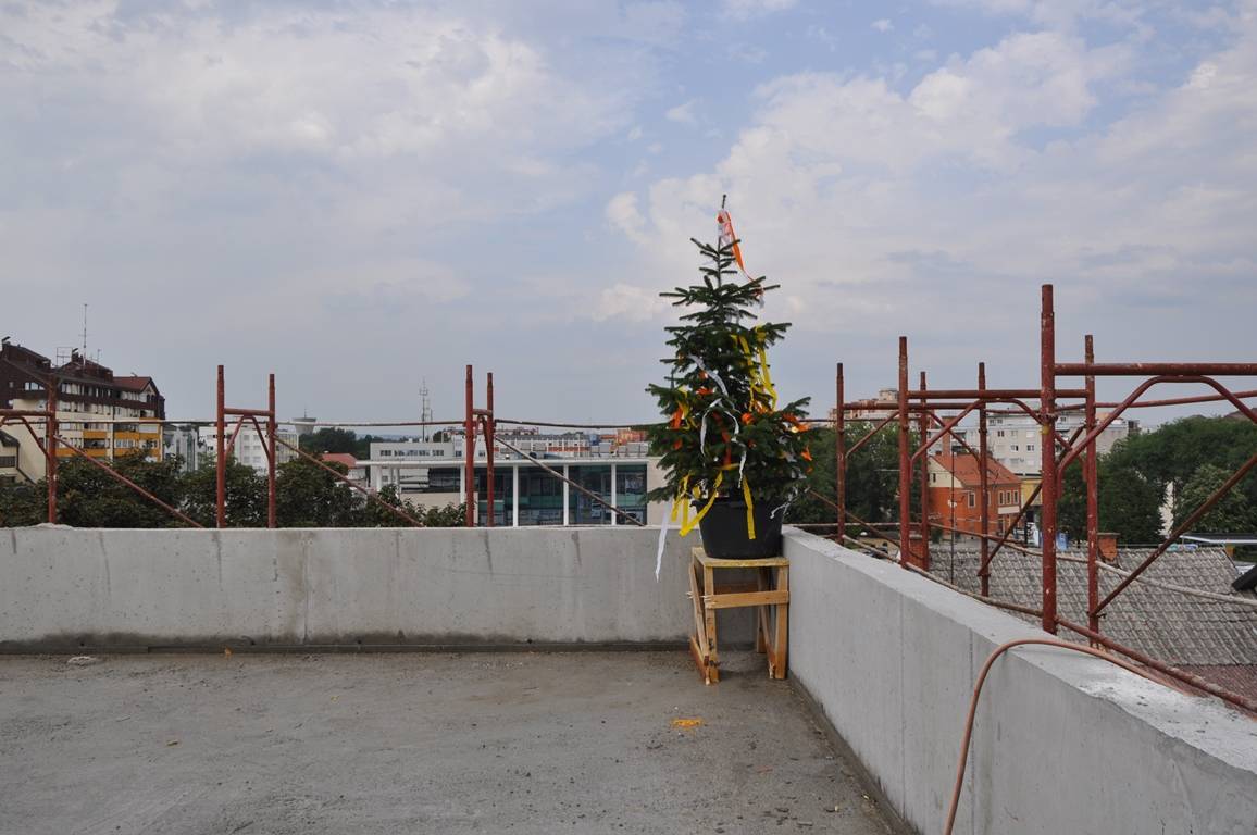 Ob dokončanju skeleta objekta v gabaritih je investitor, podjetje Cerop, danes pripravil tradicionalni odomaš. Pomembno prelomnico v gradnji so tako zapečatili s postavitvijo smrečice, ki oznanja, da so izvajalci z najtežjimi fizičnimi deli (izkopi, rušenjem, betoniranjem) končali. Na objekt pa prihajajo notranji izvajalci, ki bodo nadaljevali z inštalacijami, izvedbo tlakov, notranjih sten in podobno.