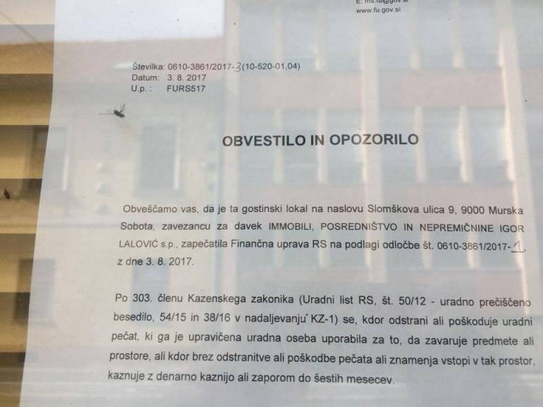 Kot je razvidno iz obvestila, je Finančna uprava Republike Slovenija gostinski lokal obiskala minuli četrtek in ga zaprla.