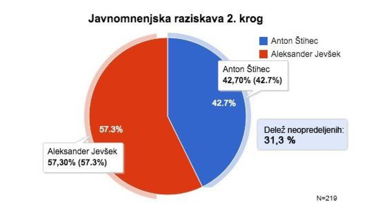 Po javnomnenjski raziskavi, ki jo je izvajala TV IDEA med 13. in 15. oktobrom, je Aleksander Jevšek s 57,3 % v prednosti pred Antonom Štihcem, ki ima 42,7 % glasov.