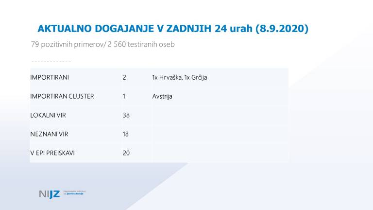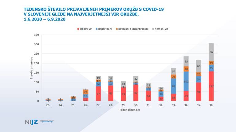 Od včerajšnjih pozitivnih primerov sta samo dva importirana, zelo veliko je bilo lokalnega vira, 20 primerov pa je še v epidemiološki preiskavi. Od včerajšnjih okužb je 18 novih okužb v domovih za starejše, od tega 15 oskrbovancev, ena okužba je potrjena pri zaposleni osebi, dva primera sta pa še v preiskavi. V šolah je bilo včeraj odkritih deset okužb pri učencih in dve pri učiteljih.