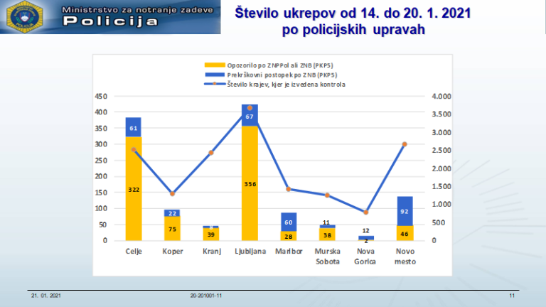 Skupno število opravljenih nadzorov od 11. do vključno 17. januarja 2021 je bilo 3.615. Izrečenih je bilo 28 prekrškovnih sankcij, 337 opozoril po zakonu o prekrških in 91 upravnih ukrepov.