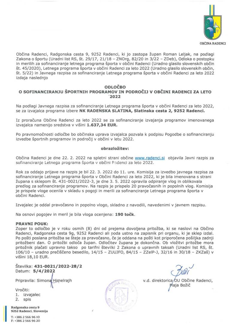 V Nogometnem klubu Radenska Slatina so se odzvali na očitke o razpolaganju z občinskimi sredstvi. Po teh sodeč naj bi klub za svoje delovanje prejemal veliko višja sredstva od občine kot jih dejansko.