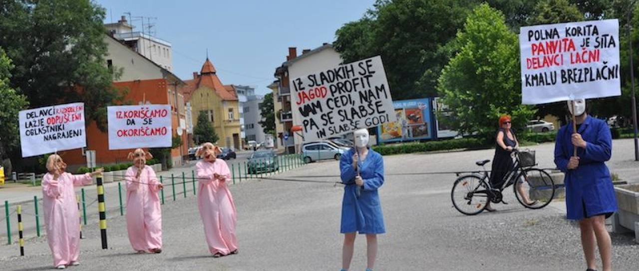 Z napisi »Polna korita Panvita je sita delavci lačni kmalu brezplačni«, »Iz sladkih se jagod profit vam cedi, nam pa se slabše in slabše godi«, »Izkoriščamo, da se okoriščamo« in »Delavci razdrobljeni lažje odpuščeni oblastniki nagrajeni« so se jasno uprli izkoriščanju zaposlenih.