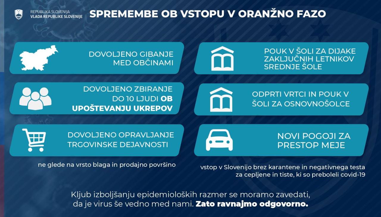 Minister za notranje zadeve Aleš Hojs, je na vladni novinarski konferenci postregel z dobro novico, in sicer, da s ponedeljkom, ni več omejitve gibanja na regije in občine. To pomeni, da se lahko prosto gibljemo po celotni državi. Zaradi tega se črtajo tisti členi, ki so omogočali prijavo začasnega bivališča, ravno tako ni več omejena rekreacija zgolj na statistično regijo, možno se je rekreirati po celotni državi.