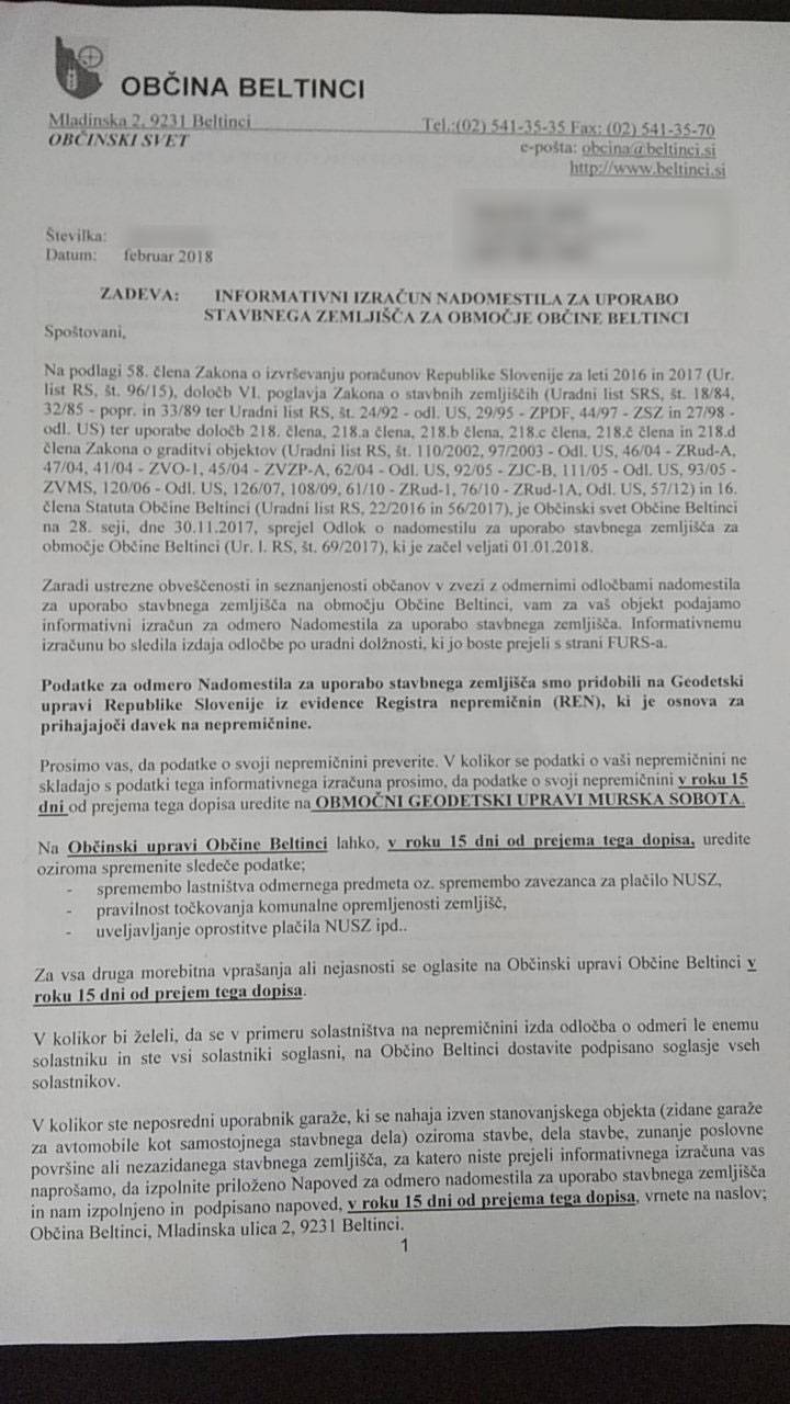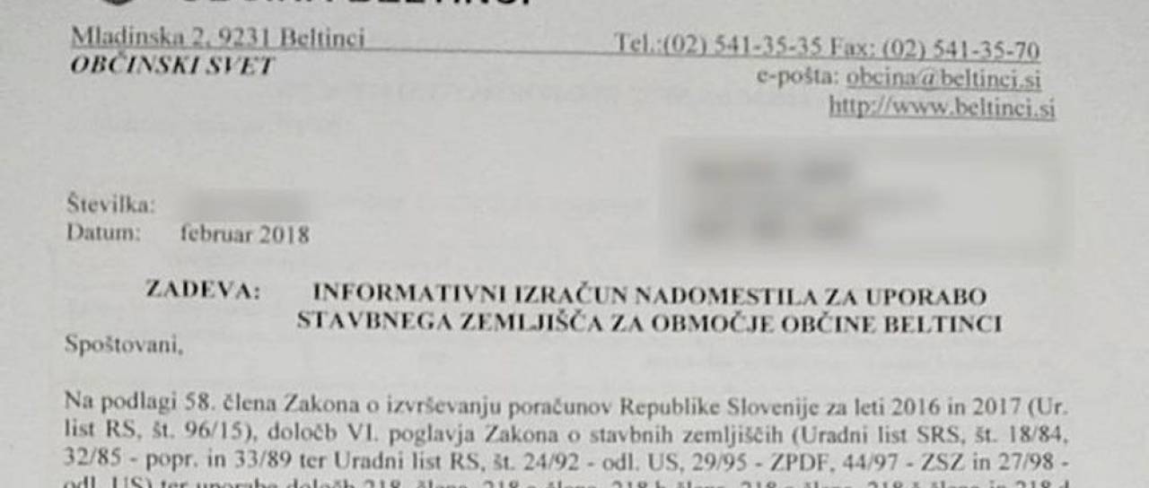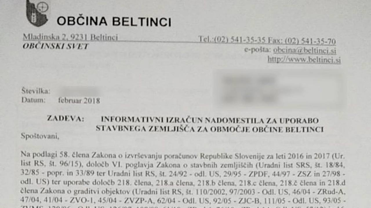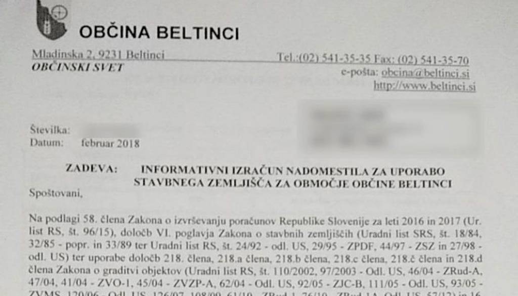 Občina Beltinci pa je lansko jesen sprejela nov odlok o nadomestilu za uporabo stavbnega zemljišča, s čimer se je zdaj, kot kaže, nekaterim močno zvišal informativni izračun nadomestila.
