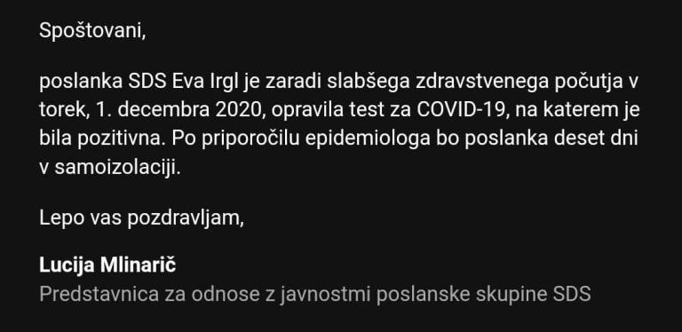 Iz poslanske skupine SDS so sporočili, da je poslanka Eva Irgl zaradi slabšega zdravstvenega počutja včeraj opravila test za covid-19, na katerem je bila pozitivna. Po priporočilu epidemiologa bo poslanka deset dni v samoizolaciji.