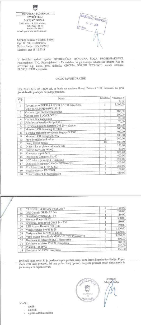 Jutri ob 14. uri naj bi v Gornjih Petrovcih tako skušali prodati predmete v občinski lasti, katerih izklicne cene v skupnem seštevku znašajo približno 25.000 evrov.