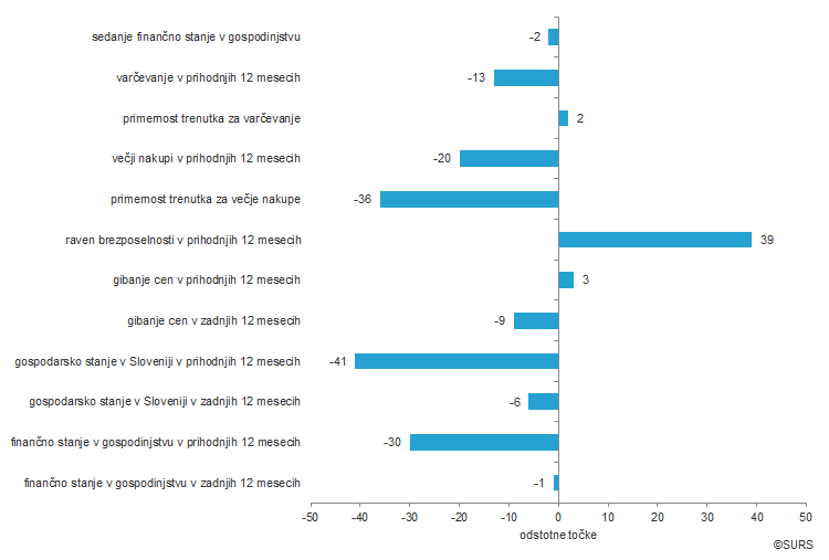 Na mesečni ravni so se poslabšale vse štiri komponente, ki sestavljajo kazalnik mnenja potrošnikov: pričakovanje potrošnikov glede finančnega stanja v gospodinjstvu za 30 odstotnih točk, pričakovanje o gospodarskih razmerah v državi za 41 odstotnih točk, pričakovanje glede števila brezposelnih za 39 odstotnih točk, pričakovanje potrošnikov glede varčevanja pa za 13 odstotnih točk.
