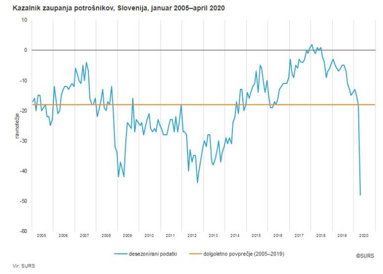 Po podatkih Statističnega urada Republike Slovenije je kazalnik mnenja potrošnikov v aprilu 2020 upadel za 30 odstotnih točk glede na prejšnji mesec ali za 41 odstotnih točk glede na lanski april.