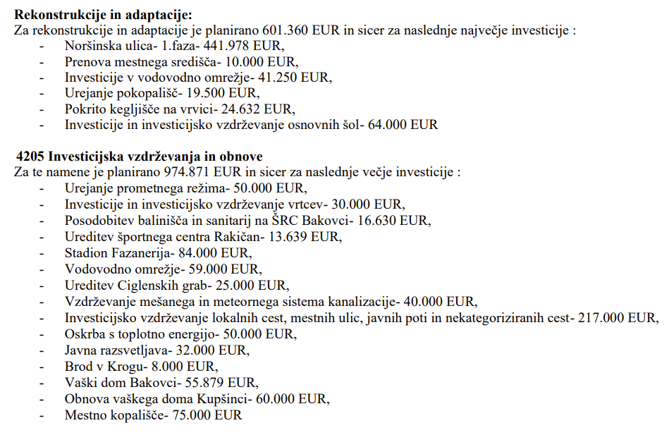 Za rekonstrukcije in adaptacije je planirano 601.360 evrov, največ za Noršinsko ulico - I. faza (441.978 evrov) in za vzdrževanja osnovnih šol (64.000 evrov).