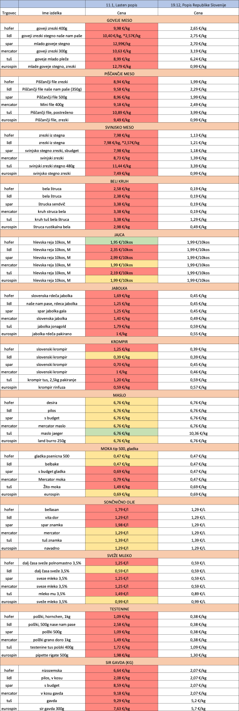 - Rdeče celice: Cena izdelka v našem popisu je bila višja kot v uradnem popisu.