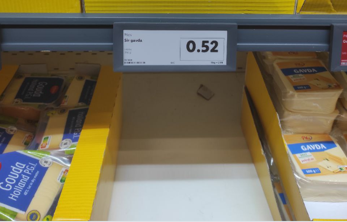 Zaloge ugodnega mesa so v Lidlu že pošle, kar velja tudi za sir gavdo v 250-gramskem pakiranju. Pod ceno je le še prazna škatla, sira po tej ceni se je lahko očitno razveselilo le omejeno število kupcev.