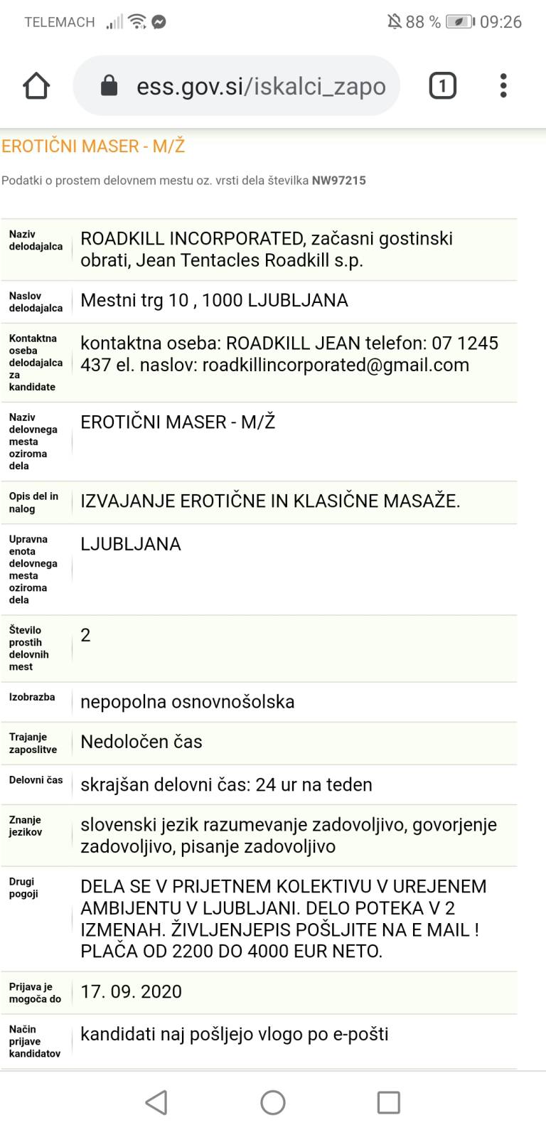 Delodajalec Roadkill Incorporated, sicer registriran kot začasni gostinski obrati, je objavil oglas za delo za erotične maserje moškega ali ženskega spola. Sprejemajo tudi kandidate z nedokončano osnovno šolo, obljubljajo pa vse do štiri tisoč evrov neto mesečne plače.