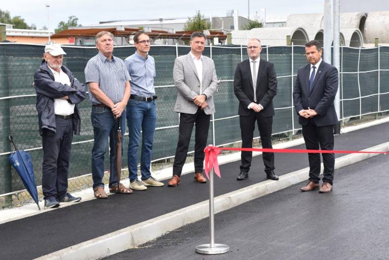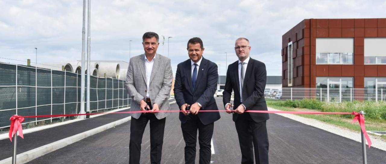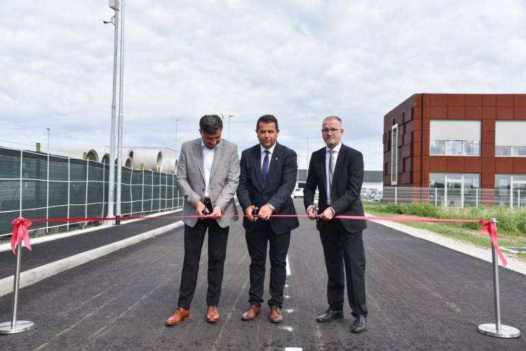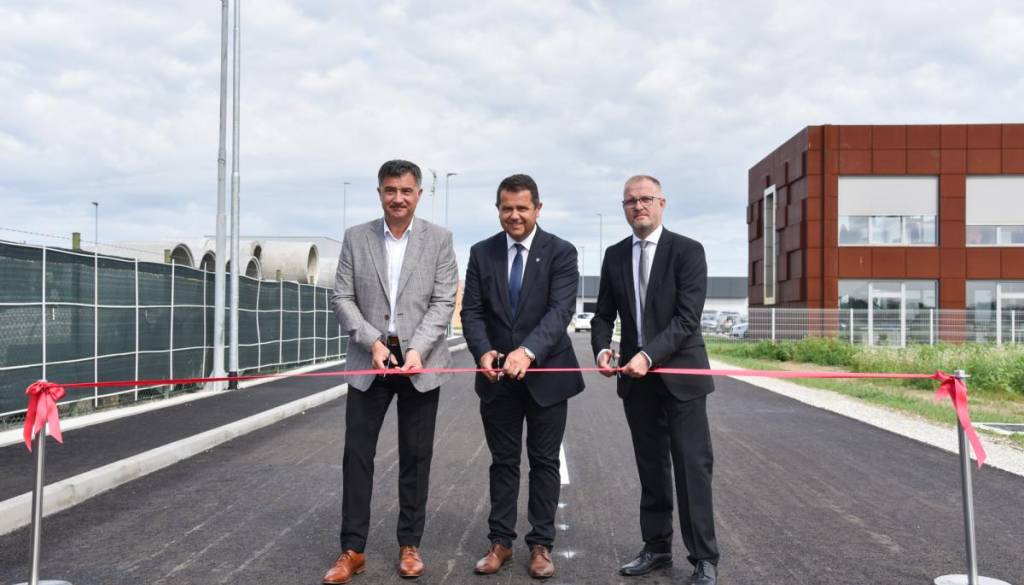 Direktor Pomurske gospodarske zbornice Robert Grah, direktor gradbenega podjetja Legartis Matjaž Hozjan in župan Občine Lendava Janez Magyar so simbolično predali svojemu namenu investicijo »Razširitev industrijsko poslovne cone Lendava«.