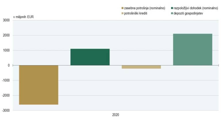 Kljub povečanim finančnim sredstvom, ki so jih imela gospodinjstva na voljo, je zasebna potrošnja v Sloveniji v lanskem letu močno upadla, enaka gibanja pa so bila prisotna v vseh ostalih državah evrskega območja. Razlogi so povezani zlasti z omejitvenimi ukrepi, potrebnimi za zajezitev širjenja virusa, delno pa tudi s previdnostnim obnašanjem prebivalcev.