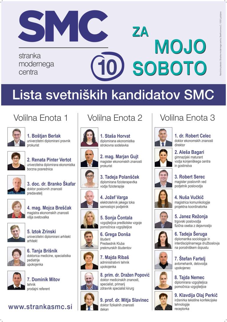 V prihodnjem mandatu bo svetniška skupina SMC še naprej stremela k temu, da se bodo proračunska sredstva racionalno porabljala, da bodo socialni transferji ostali najmanj v enakem obsegu kot v iztekajočem mandatu, da se izgradi vzhodna in zahodna soboška obvoznica, da se prednostno pristopi k obnovi dotrajane prometne in kanalizacijske infrastrukture v občini, da ne bo prihajalo do neutemeljenih dvigov cen komunalnih storitev, da se sredstva za šport in delovanje društev ne zmanjšujejo, da se dokonča širitev SOIC z namenom privabljanja novih investitorjev, da bomo nadalje vlagali v izobraževalno, kulturno in športno infrastrukturo in nenazadnje, da se občina še naprej razvija kot turistično prepoznavna in zelena destinacija.