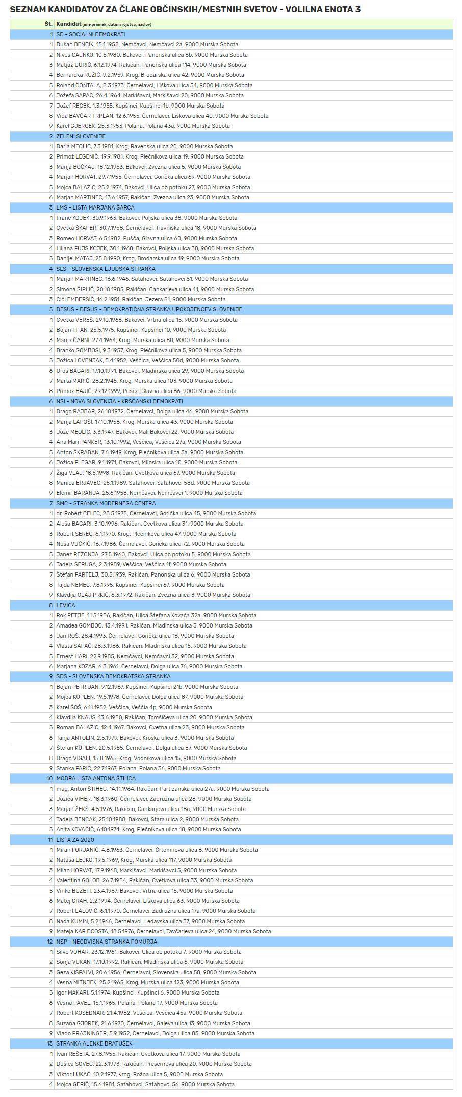 - V tretji volilni enoti je med kandidati stranke NSi tudi Ana Mari Panker, nekdanja tekmovalka resničnostnega šova Big Brother, na listi Levice pa najdemo Amadeo Gomboc, prostovoljko dobrodelne organizacije Anina zvezdica. Prav tako v tretji volilni enoti se bo na listi stranke SMC za svetniški stolček potegoval Robert Serec, nekdanji direktor Pomurskih mlekarn.