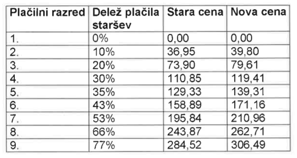 Cena dnevnega programa, ki je do zdaj znašala 439,70 evra, bi se ob sprejetju predloga zvišala za 28,54 evra. To pomeni, da bi nova cena dnevnega programa za otroka znašal 468,24 evrov na otroka mesečno.