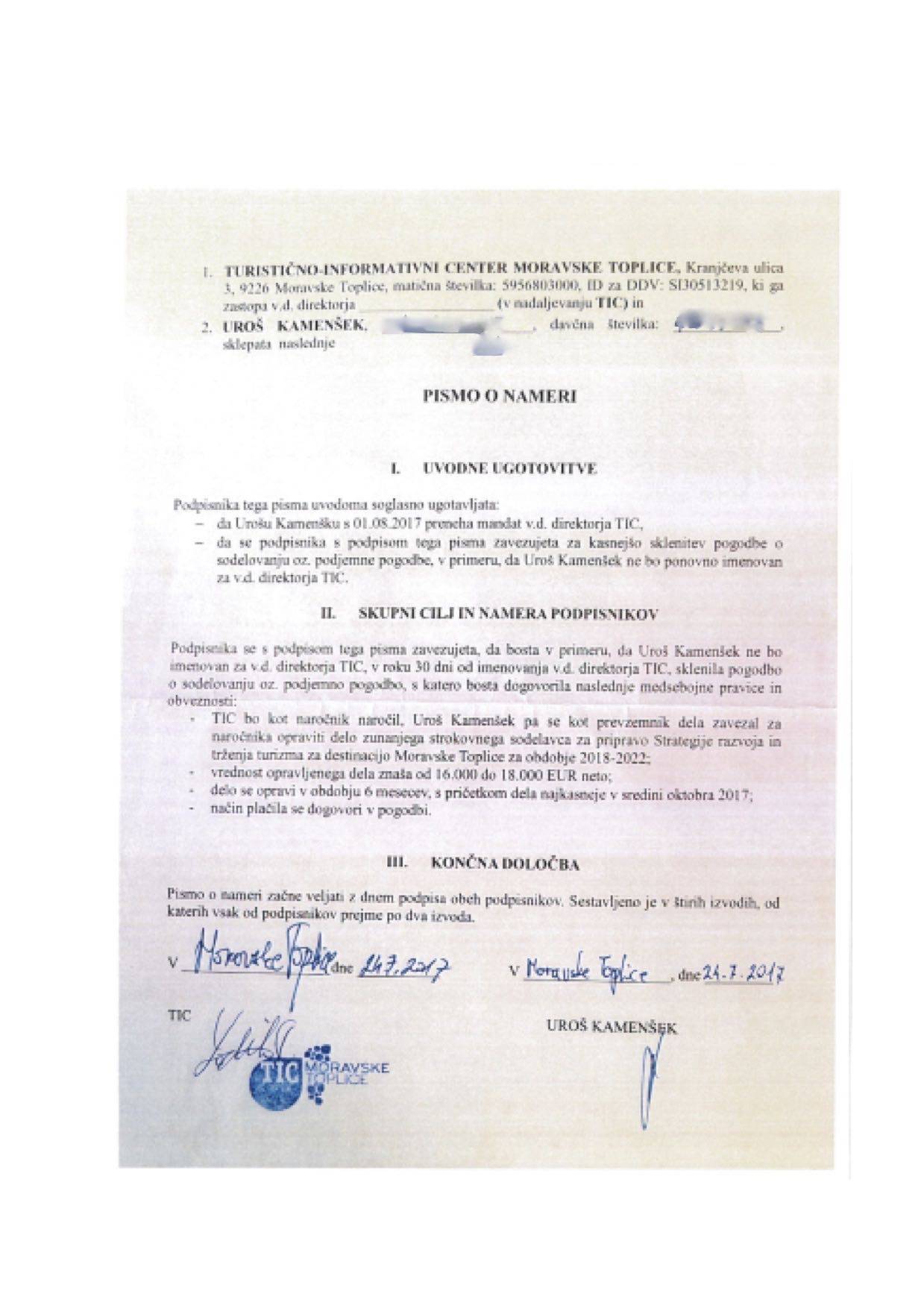 Moravskotopliški podžupan in predsednik sveta zavoda TIC Štefan Kodila ter Uroš Kamenšek sta namreč na dan glasovanja o novem vršilcu dolžnosti podpisala pismo o nameri, iz katerega je razvidno, da sta se vpletena zavezala za sklenitev pogodbe o sodelovanju v primeru, da Kamnšek ne bo potrjen za še en mandat na čelu TIC-a.