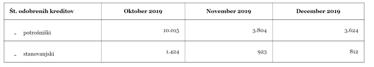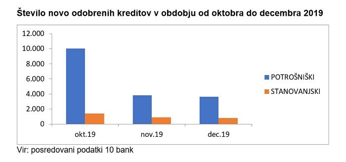 »Iz podatkov, ki jih je posredovalo deset bank, je razvidno, da je v primerjavi s številom novo odobrenih potrošniških in stanovanjskih kreditov v oktobru v novembru odobrenih le 37,98 odstotka potrošniških in 64,82 odstotka stanovanjskih kreditov ter v decembru le 36,19 odstotka potrošniških ter 57,02 odstotka stanovanjskih kreditov,« so sporočili iz Združenja bank Slovenije.