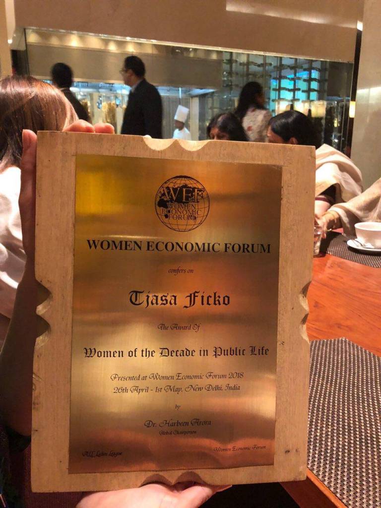 Ljubljanska podžupanja Tjaša Ficko, sicer rojena v Murski Soboti, se je udeležila globalne konference Ženski gospodarski forum v New Delhiju. Fickova je na tej konferenci včeraj prejela tudi prestižno nagrado Ženska desetletja v javnem življenju.