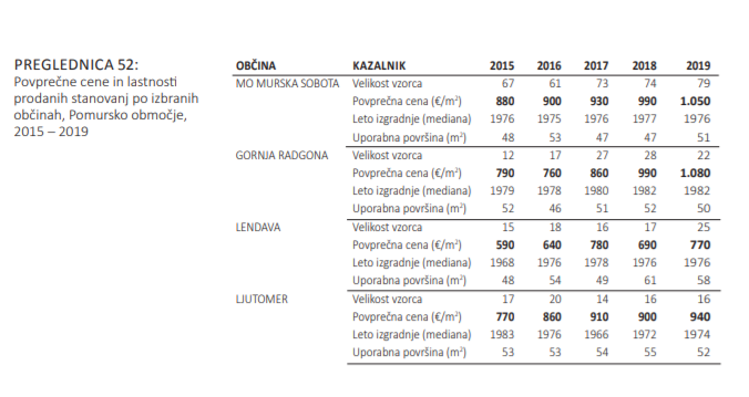 Povprečna cena stanovanja v občini Murska Sobota je lani prvič po letu 2008 presegla mejo 1.000 €/m2. Cene stanovanj v Gornji Radgoni pa so lani statistično celo presegle cene v Murski Soboti, in sicer na račun manjše povprečne starosti prodanih stanovanj in večje rasti cen v zadnjih letih.