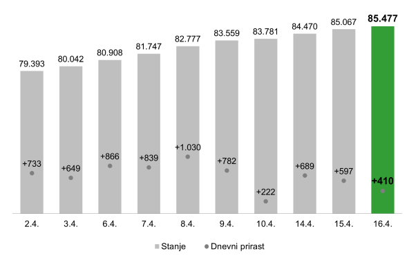 Konec marca je bilo pri Zavodu republike Slovenije prijavljenih 77.855 brezposelnih oseb, kar je za 0,5 odstotka več kot mesec pred tem. Brezposelnost v Sloveniji je bila v primerjavi s stanjem pred letom večja za 1,7 odstotka. Po neuradnih podatkih ZRSZ, ki jih Zavod vsakodnevno objavlja na svoji spletni strani, se je do 16.4 v evidenco vpisalo 85.477 brezposelnih oseb.