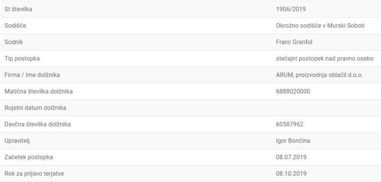 Okrožno sodišče v Murski Soboti je začelo stečajni postopek nad podjetjem Arum, ki je zraslo na pogorišču Mure. Upniki lahko svoje terjatve do podjetja prijavijo do 8. oktobra.