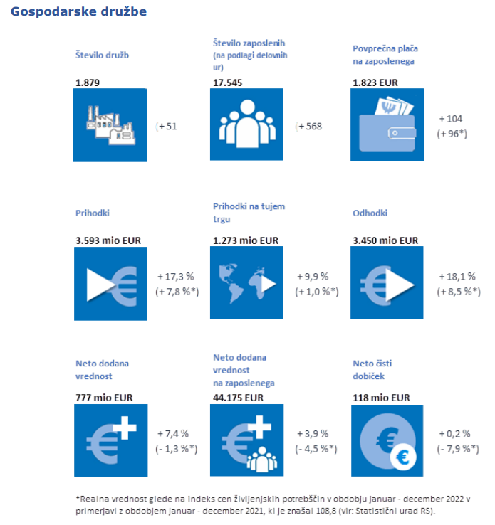 Če te podatke primerjamo s podatki o poslovanju družb iz celotne Slovenije, so pomurske družbe, ki predstavljajo zgolj 2,7 odstotka vseh družb v Sloveniji, v letu 2022 zaposlovale 3,3 odstotka vseh zaposlenih ter ustvarile za 2,4 odstotkov vseh prihodkov.