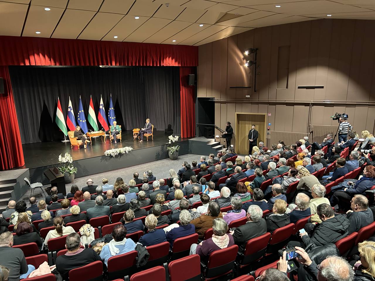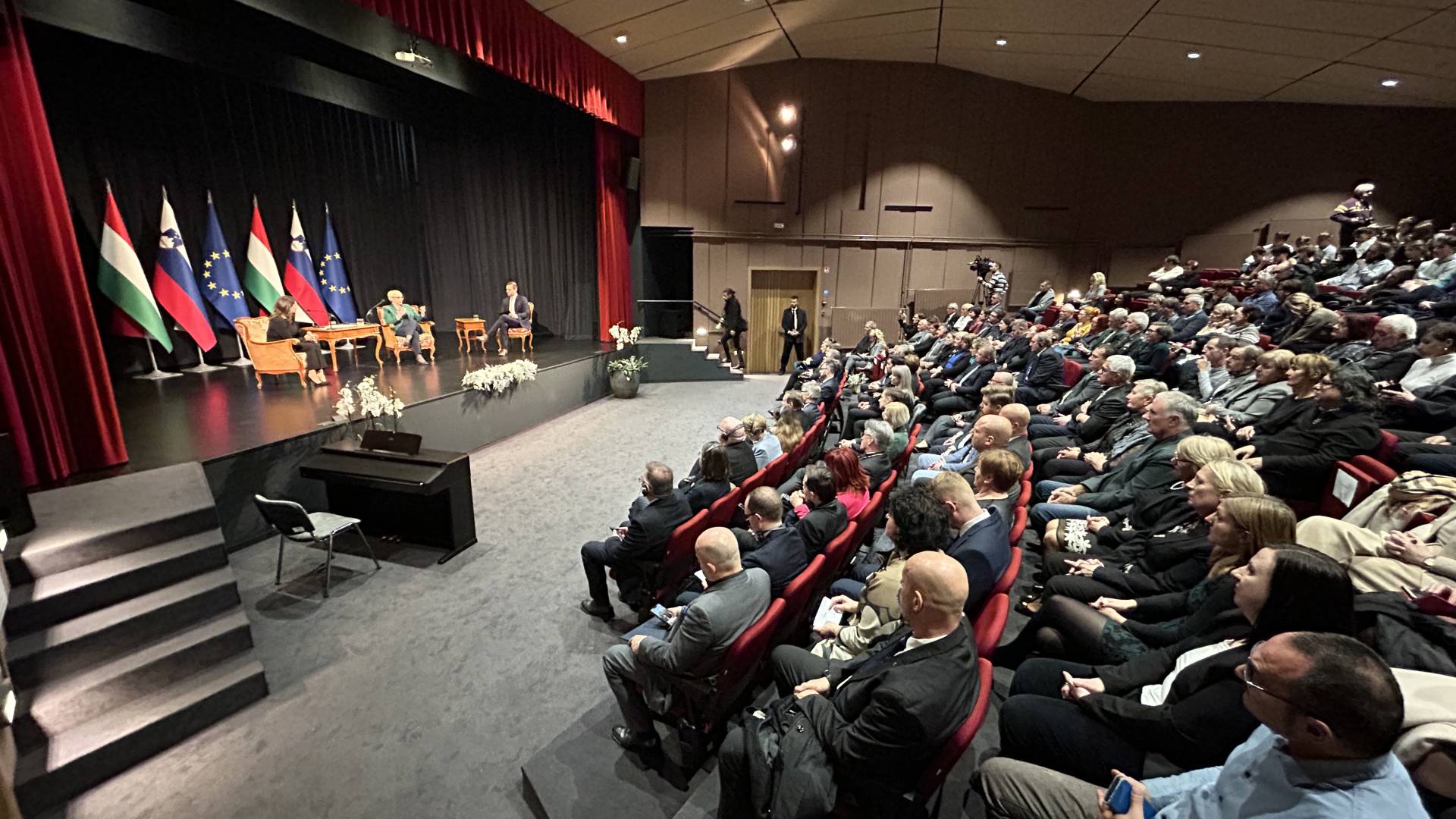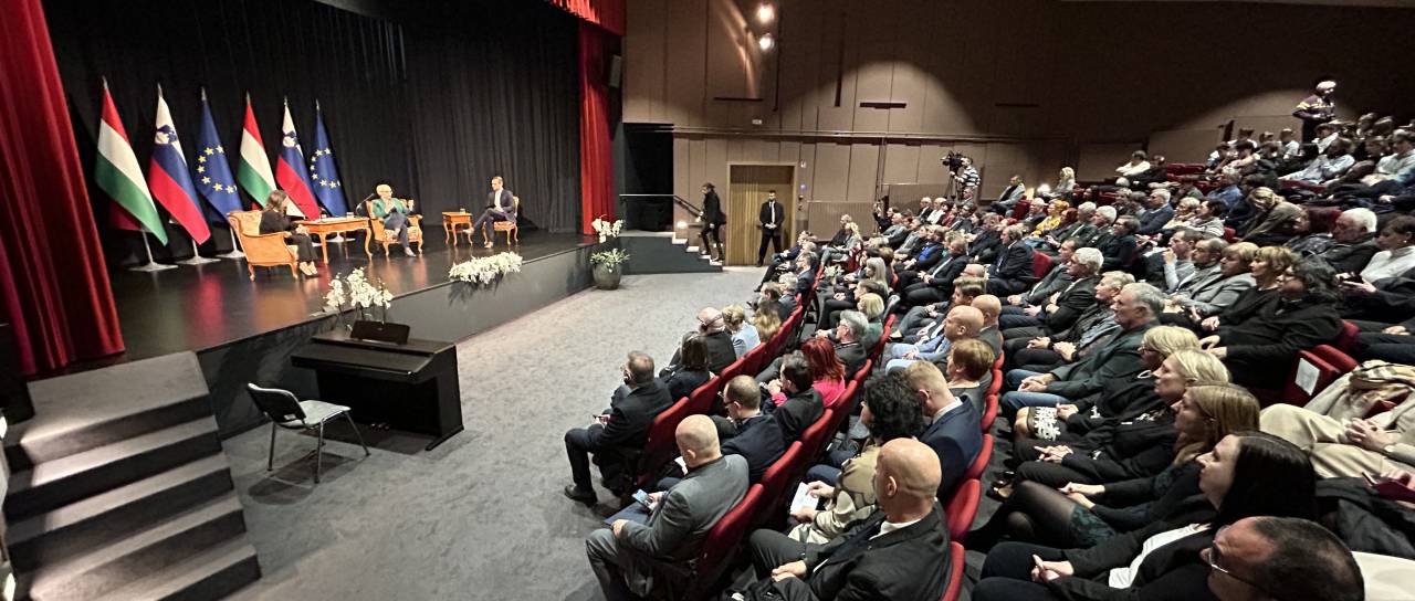 Pomen dvojezičnosti in skrbi za manjšine v ospredju pogovora predsednic Slovenije in Madžarske pred polno dvorano v Dobrovniku.